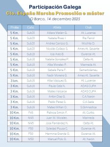 Un total de 21 atletas galegos e galegas tomarán parte esta fin de semana no Campionato de España de Marcha de promoción e máster que xuntará no Barco de Valdeorras a un total de 180 atletas achegados de todas as federacións autonómicas do Estado.