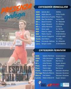 No círculo de peso, o plusmarquista galego e subcampión de España Sub23 Fernando Vallines, buscará estar por enriba da súa MMP de 17.53 m. que o deixarían nos postos top da clasificación. No mesmo sector a temén medallista no campionato de España Sub23 Xiana Lago do Ría Ferrol, con 14.54 m. loitará de igual modo por lograr un posto importante.